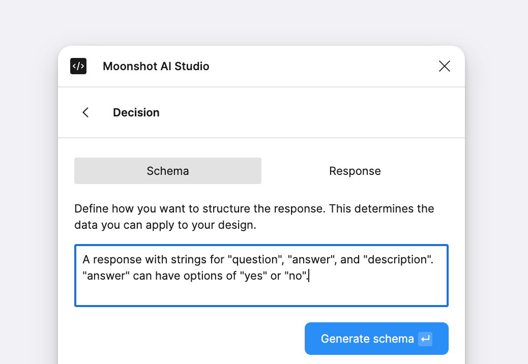 This schema generates a response of three string values (“question”, “answer”, and “description”). The “answer” property requires the response to be either “yes” or “no”, which we’ll use to set a component variant in another example.Generate a schema with a prompt